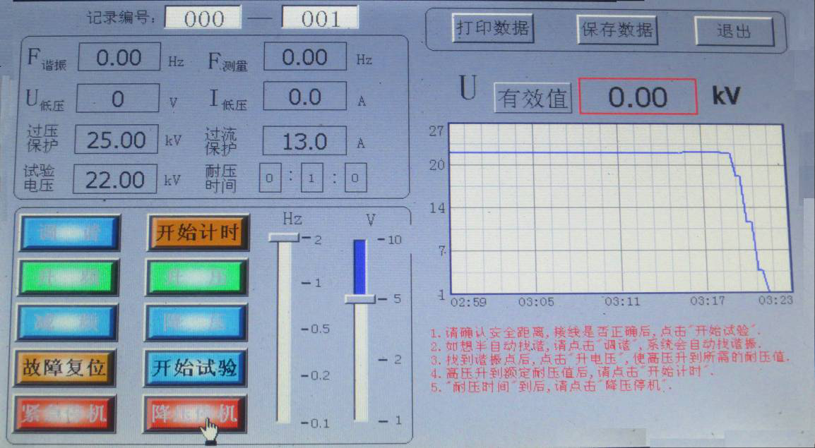 當U諧振電壓降壓0時,試驗完成,如想查詢試驗記錄,請在降壓前點擊保存數據,降壓后點擊“文件管理”; 顯示界面如圖所示。