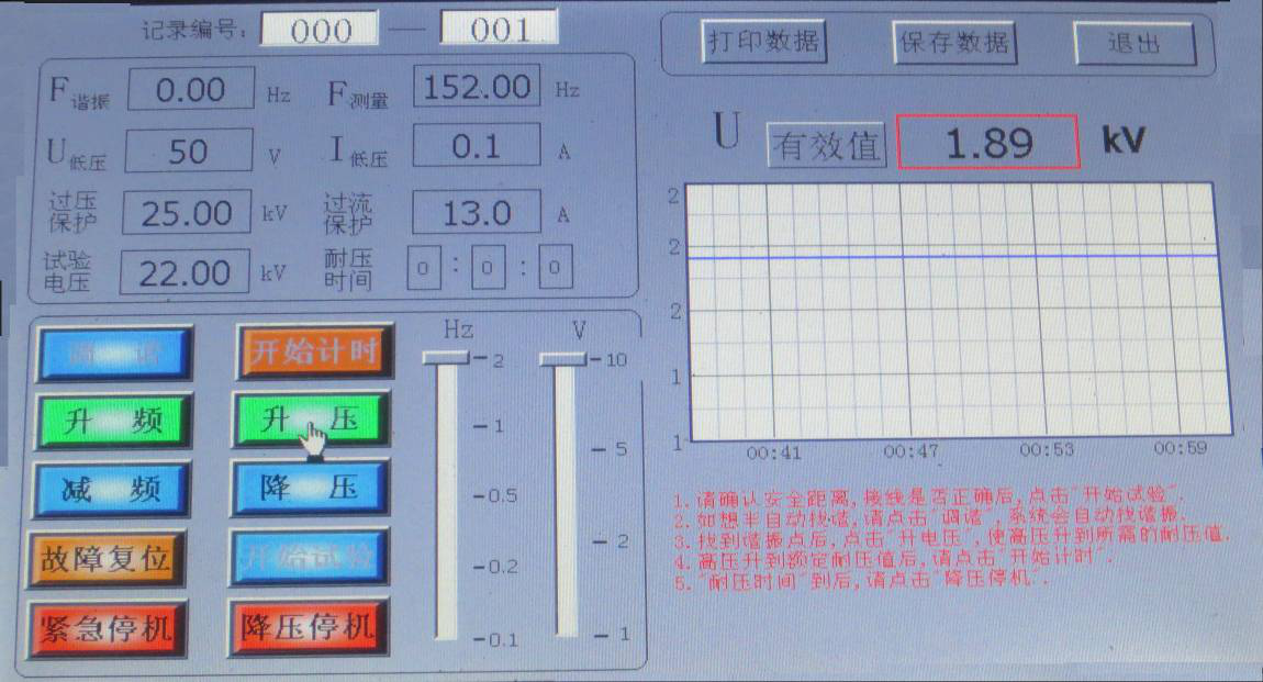 如不想自動找諧振點,先點擊“升電壓”,將“U低壓”升到50V,再點擊“升頻率”來找諧振點,找到諧振點后,點擊“升電壓”, 顯示界面如圖所示。