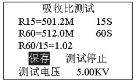 正在測試,若想停止測試,按確認鍵停止測試。吸收比測試完畢后自動計算比值,進入是否保存提示。