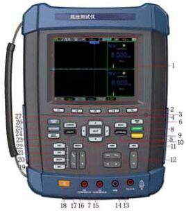 手持式局放測試儀主機的前面板分為若干功能區,根據上圖標注標號分別為: