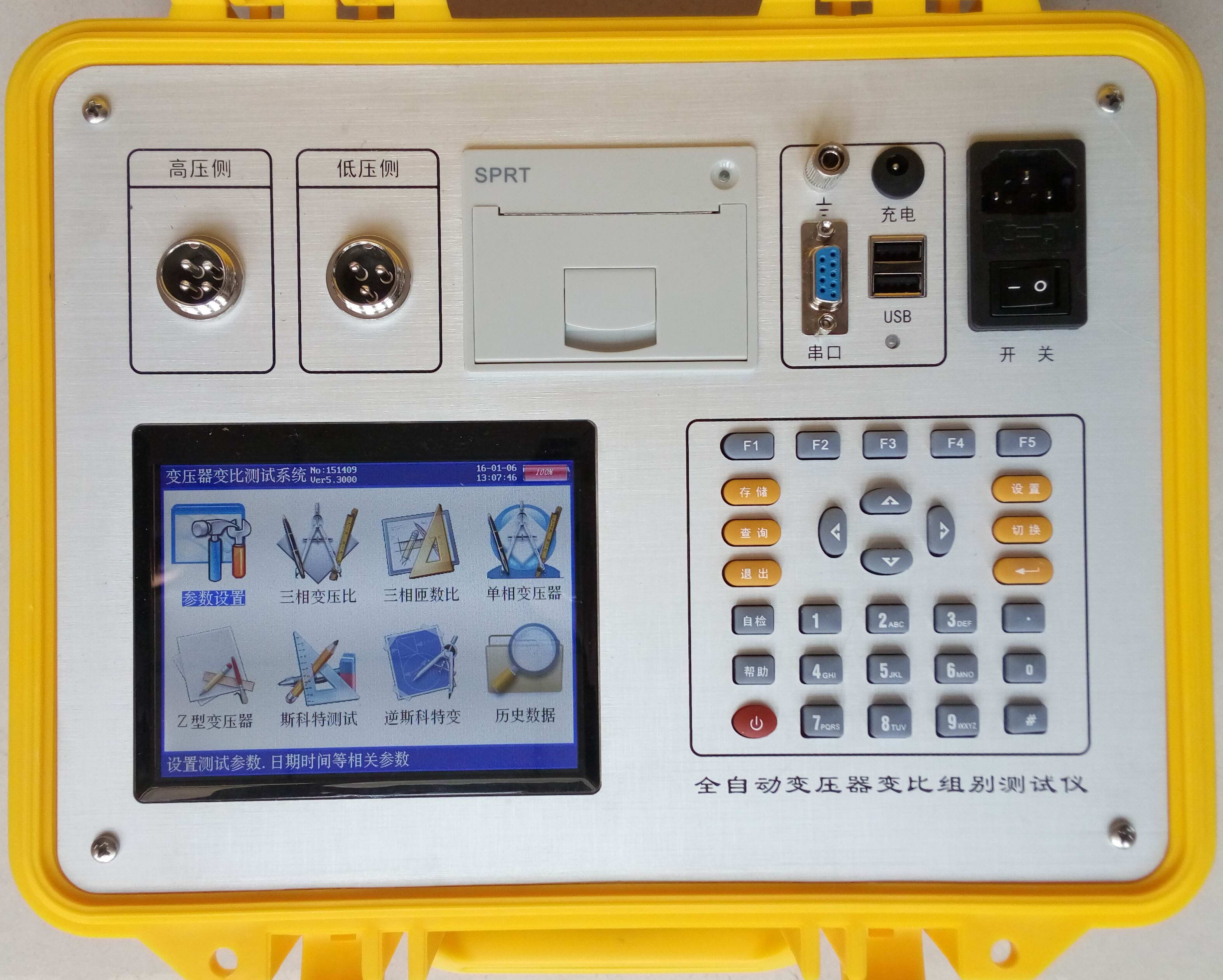 儀器左側(cè)上部是變比測試航空插頭,高壓側(cè),低壓側(cè)端子。左側(cè)下方是彩色液晶屏,右側(cè)下部是標(biāo)準(zhǔn)30鍵的控制鍵盤;在儀器的右側(cè)上部是打印機(jī)、接地端子、充電口、USB接口、RS232接口、電源線插口、工作開關(guān)。