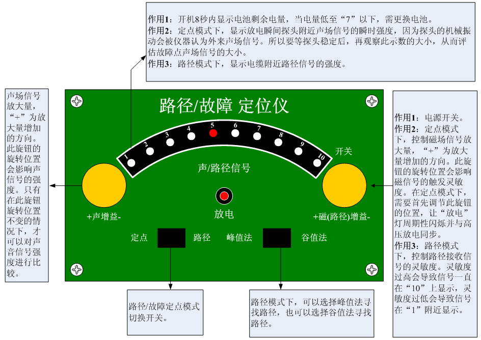 步驟2 將“定點/路徑”模式開關切換到“路徑”模式然后打開路徑/故障定位儀的電源開關,開機8秒內顯示電池電量(電量低于“7”時需更換電池?。?。