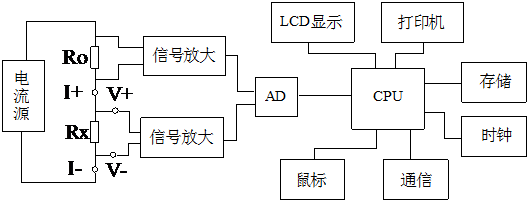 電流源的輸出恒流流過標準電阻R0和待測電阻Rx。采樣標準電阻R0上的電壓信號U0經(jīng)濾波放大后,送入ad轉(zhuǎn)換,計算出電流值I,如式(1)所示。類似地,待測電阻Rx上的電壓信號UX經(jīng)濾波和多級放大處理后被采樣并發(fā)送到ad以轉(zhuǎn)換為數(shù)字量。電阻值Rx由公式(2)計算。