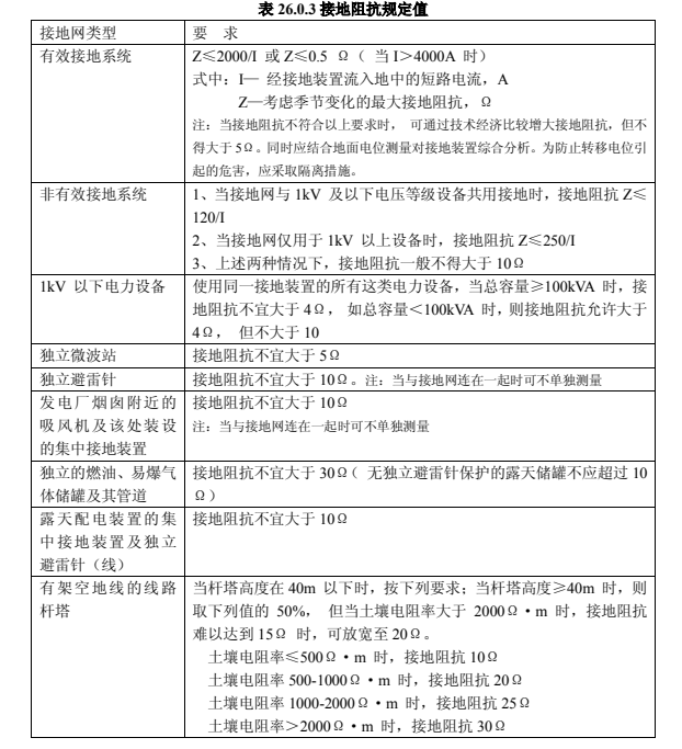 2.接地阻抗值應(yīng)符合設(shè)計要求,當(dāng)設(shè)計沒有規(guī)定時應(yīng)符合表 26.0.3 的要求。試驗方法可參照國家現(xiàn)行標(biāo)準(zhǔn)《接地裝置工頻特性參數(shù)測試導(dǎo)則》DL475 的規(guī)定,試驗時必須排除與接地網(wǎng)連接的架空地線、電纜的影響。