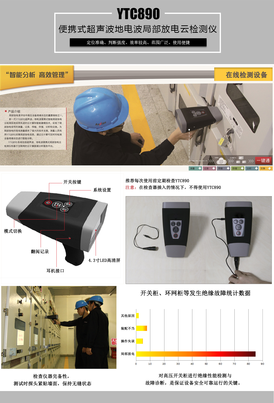 YTC890便攜式超聲波地電波局部放電檢測儀采用云計算和智能建模技術,實現了局部放電信號的測量、記錄、傳輸、存儲、分析和交換,為局部放電的現場測量提供了強大的技術支撐。測量人員利用YTC890采集局部放電信息,通過云計算可實時對檢測設備絕緣狀態進行智能診斷。