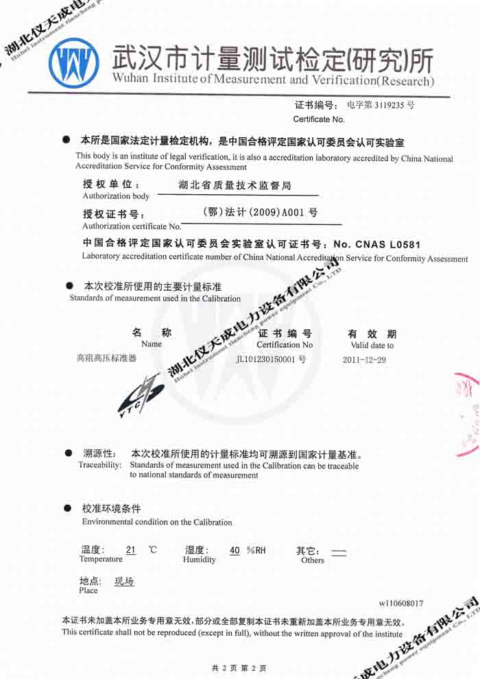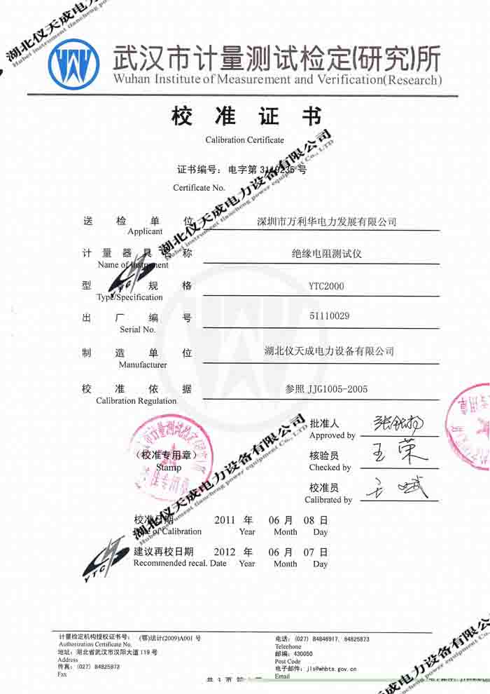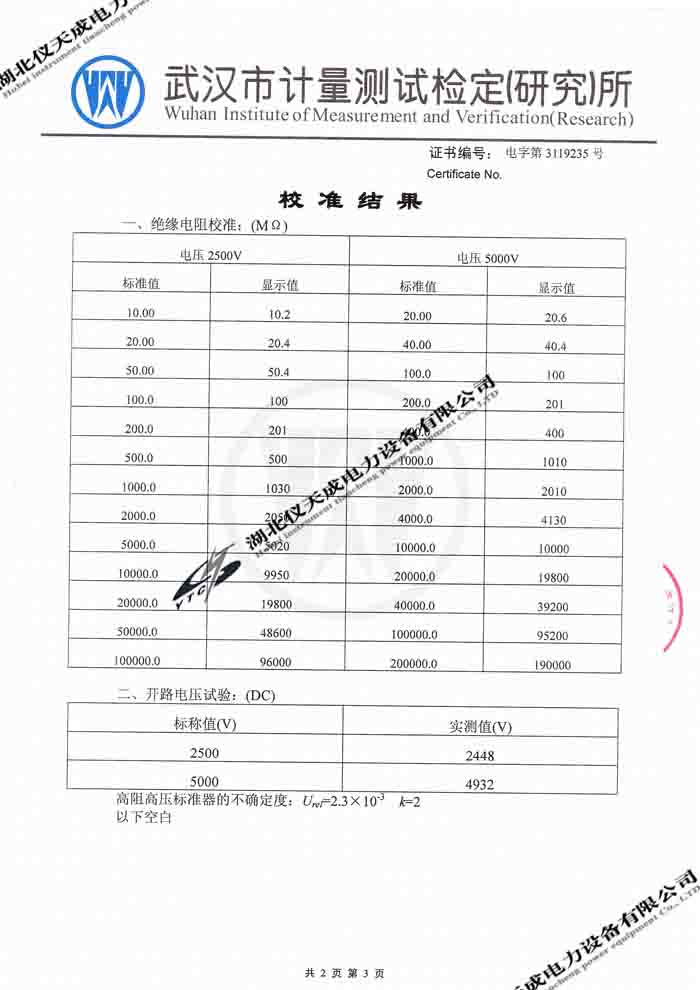 轉載:"YTC2000智能雙顯絕緣電阻測試儀的資質證書" 請注明來源于儀天成電力。 更多技術問題請致電儀天成電力客戶服務:027-87876585,技術部專線:027-87876585,在線客服:719388481