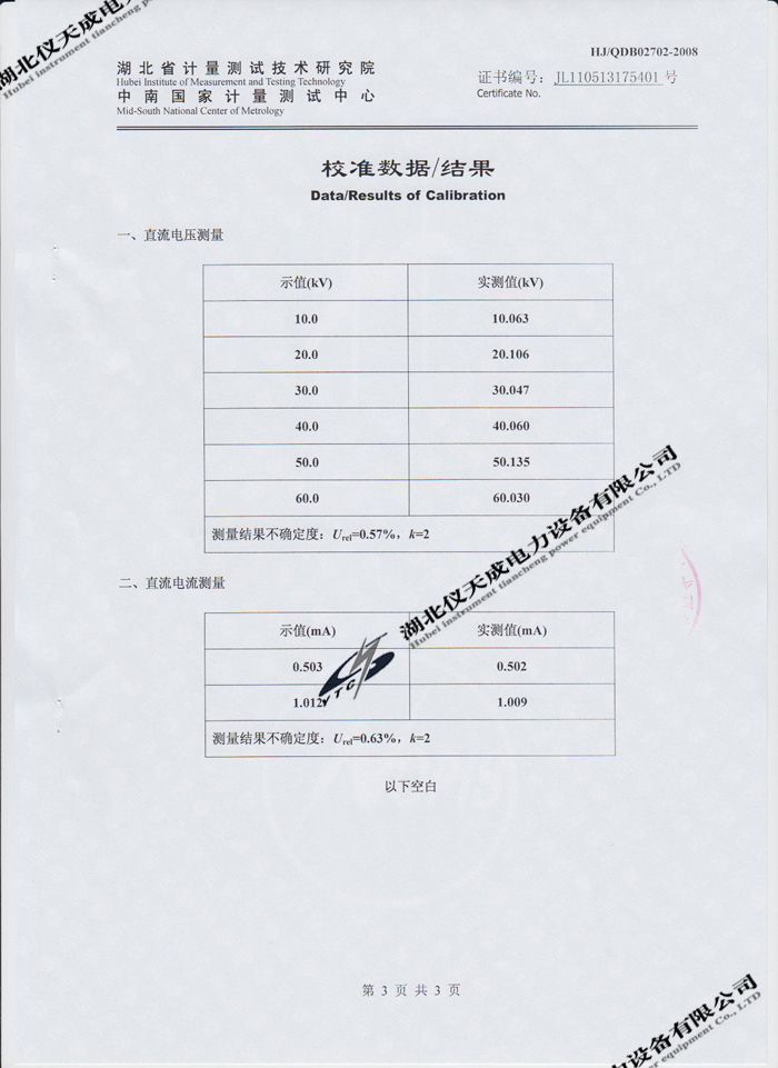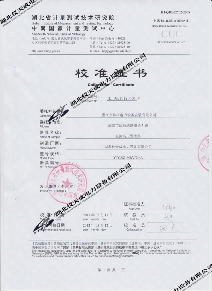 轉(zhuǎn)載:"YTCZG-60kV/2mA直流高壓發(fā)生器的資質(zhì)證書" 請注明來源于儀天成電力。 更多技術(shù)問題請致電儀天成電力客戶服務:027-87876585,技術(shù)部專線:027-87876585,在線客服:719388481
