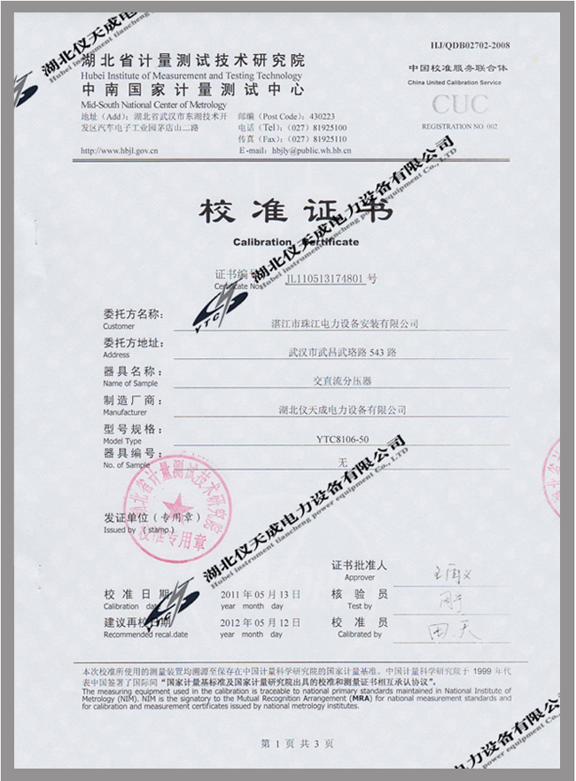 轉載:"YTC8106系列交直流分壓器鑒定證書" 請注明來源于儀天成電力。 更多技術問題請致電儀天成電力客戶服務:027-87876585,技術部專線:027-87876585,在線客服:719388481